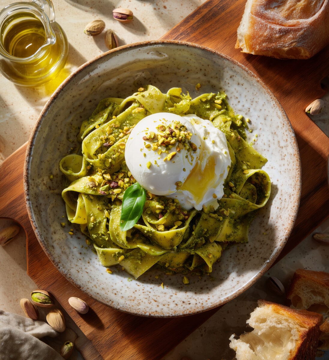 Divide the pasta among four bowls. Top each portion with half a ball of burrata. Gently tear the burrata open with a fork to let the creamy center spill out. Garnish with a sprinkle of extra chopped pistachios, a few fresh basil leaves, and a final drizzle of good olive oil. Serve immediately.
