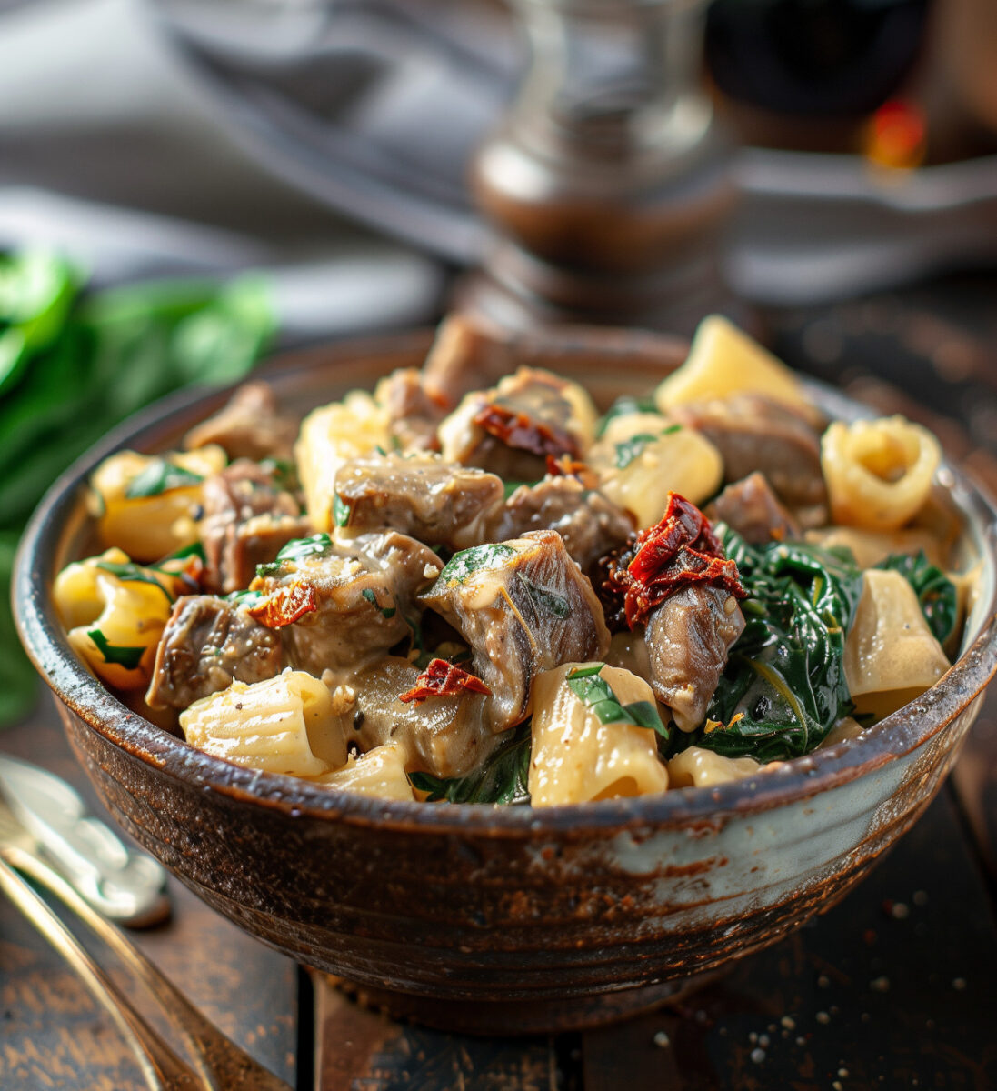 This quick and satisfying pasta dish features tender pieces of lamb, vibrant sun-dried tomatoes, and wilted spinach tossed in a luscious, creamy sauce. Served in a rustic ceramic bowl, it’s a comforting and flavorful meal that looks as good as it tastes, perfect for a weeknight dinner.