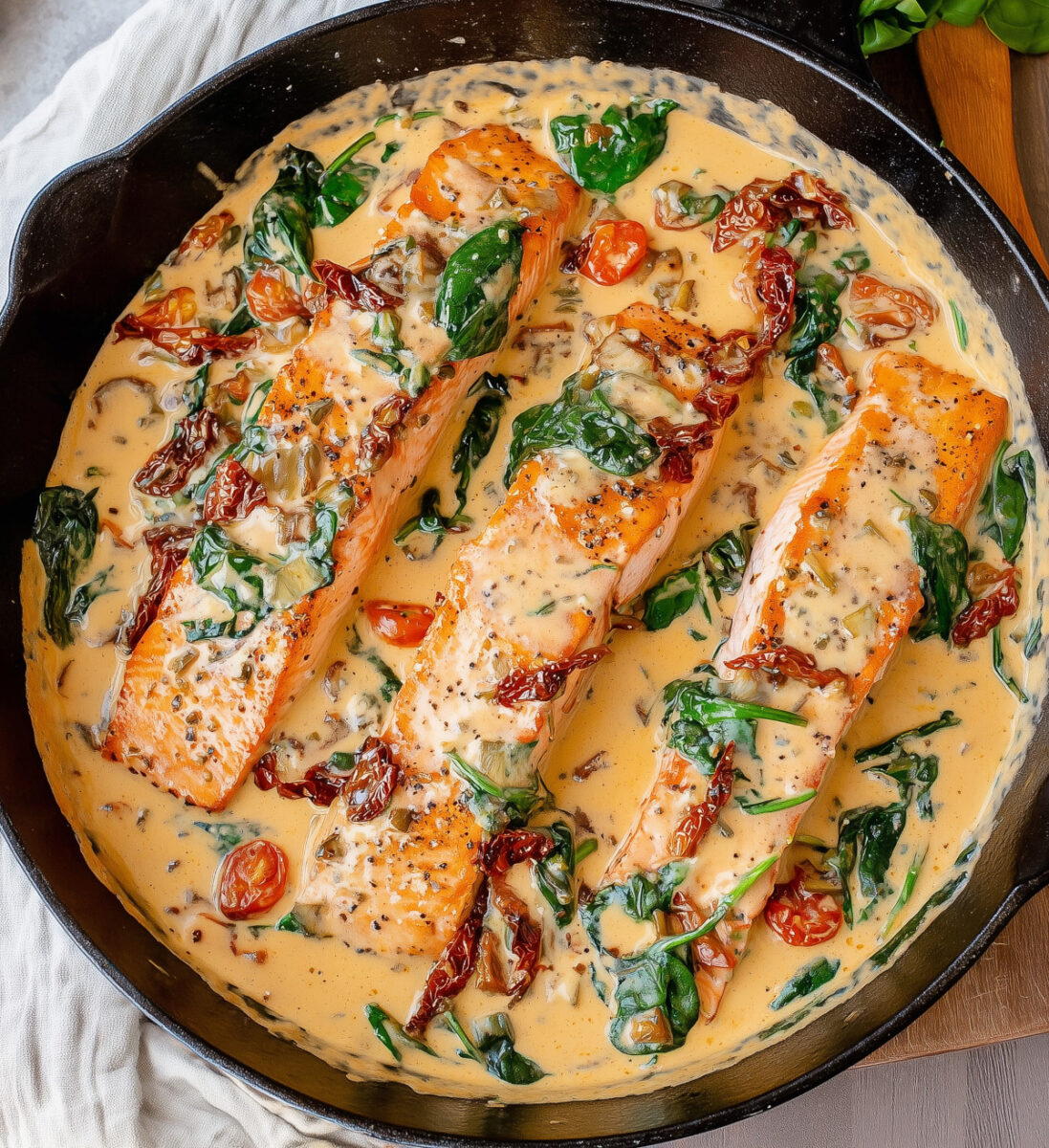 Indulge in this restaurant-quality One Pan Creamy Tuscan Salmon, ready in under 30 minutes. Tender, pan-seared salmon fillets are nestled in a luxurious garlic cream sauce, brought to life with vibrant sun-dried tomatoes, fresh spinach, and a hint of basil. It's the perfect, elegant weeknight meal that tastes like a special occasion.