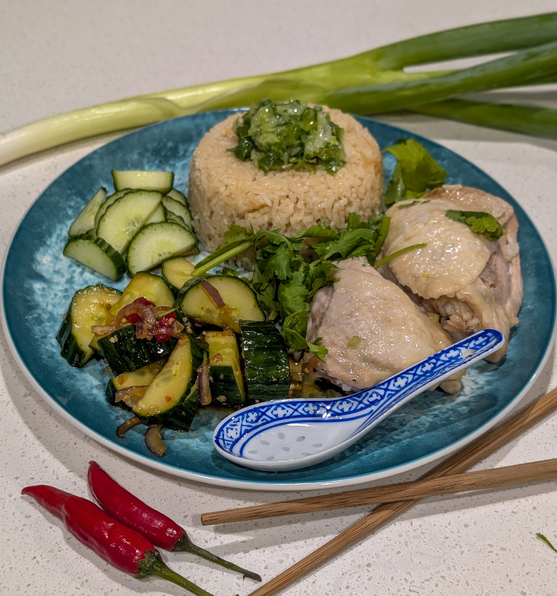 Plate up the chicken and rice, and garnish with the cucumber slices and coriander. Consider accompanying with our Chinese Scallion Sauce or Cucumber Onion Salad. Enjoy!